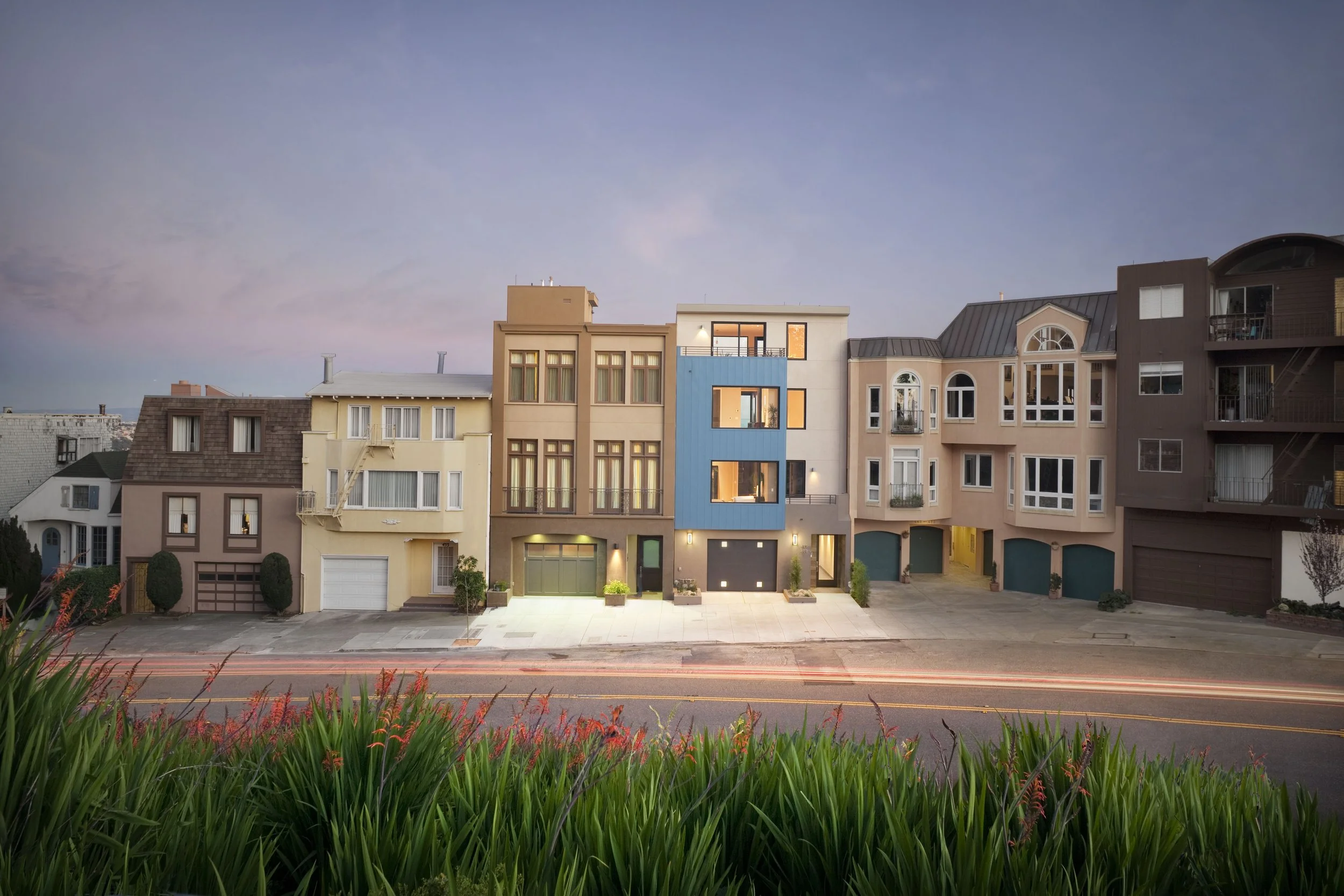 This infill development features two lots with a more traditionally styled single-family residence adjacent to a contemporary two-unit building. Both projects feature expansive views, open plans and direct connections to multiple exterior living areas.